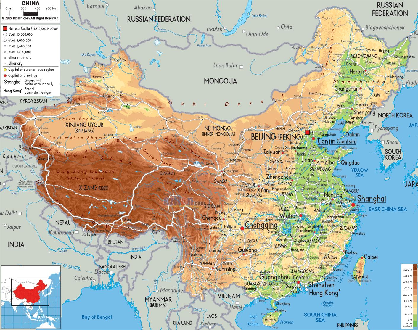 Cina in mappa. Mento mappa (Asia Orientale - Asia) per la stampa. Mento mappa (Asia Orientale - Asia) per scaricare.